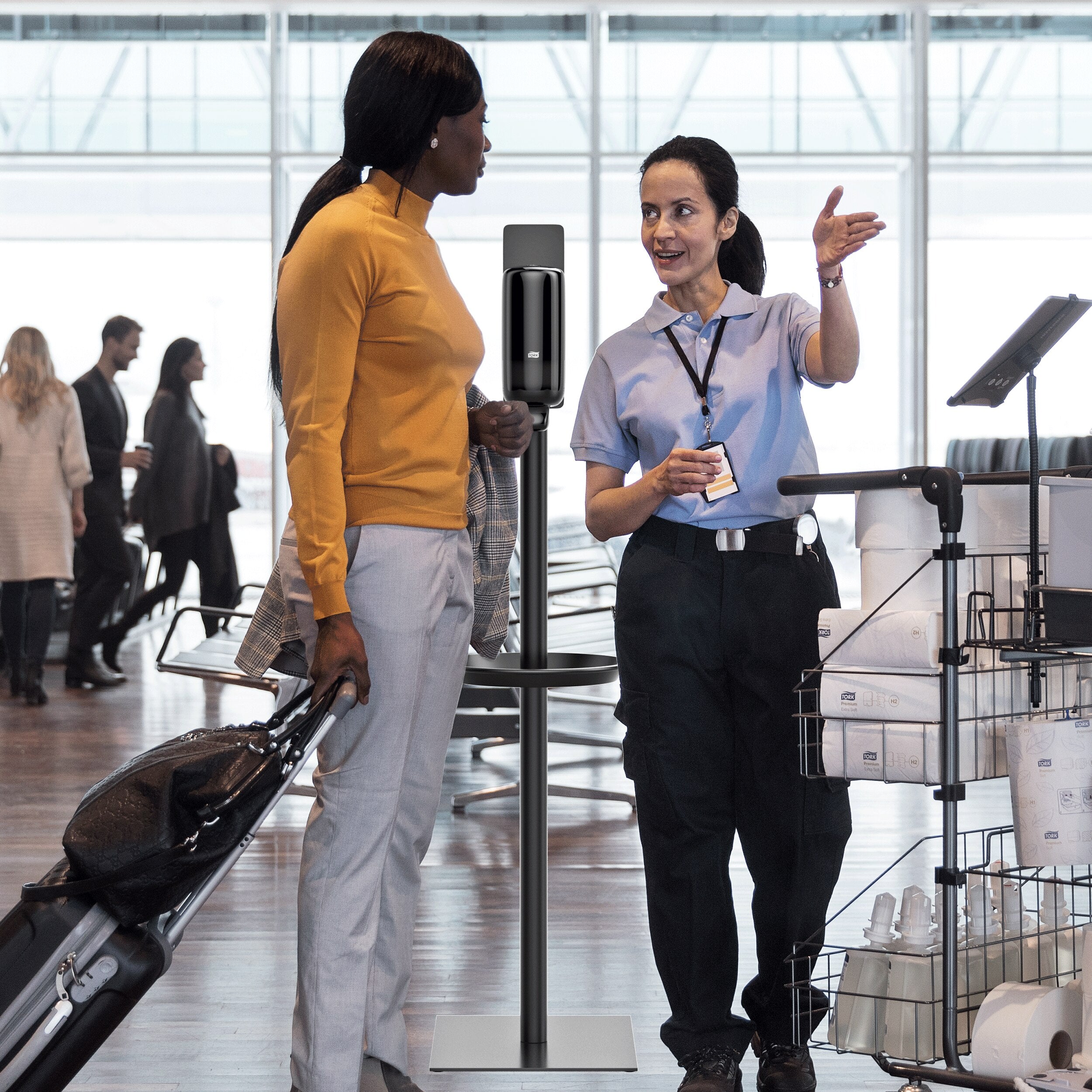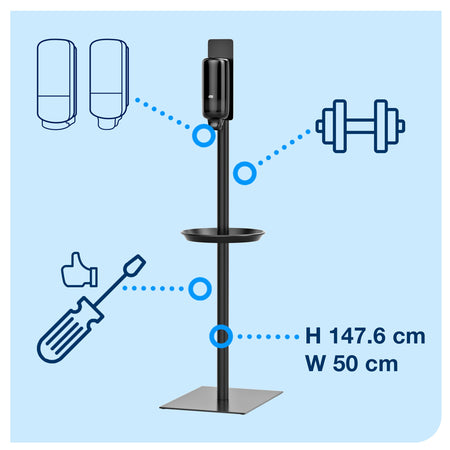 Améliorez l'hygiène des mains dans tout l'établissement grâce à ce Stand de Désinfection Tork. Placez-le là où vous en avez le plus besoin afin de rendre l'hygiène des mains accessible dans les zones à haute fréquentation ou éloignées et privées d'eau. Ce stand en métal solide est compatible avec les Distributeurs Tork S1, S2 et S4 : il s'utilise avec les gels hydro-alcooliques, mousses et liquides désinfectants pour les mains Tork, et avec les distributeurs manuels ou à capteur.