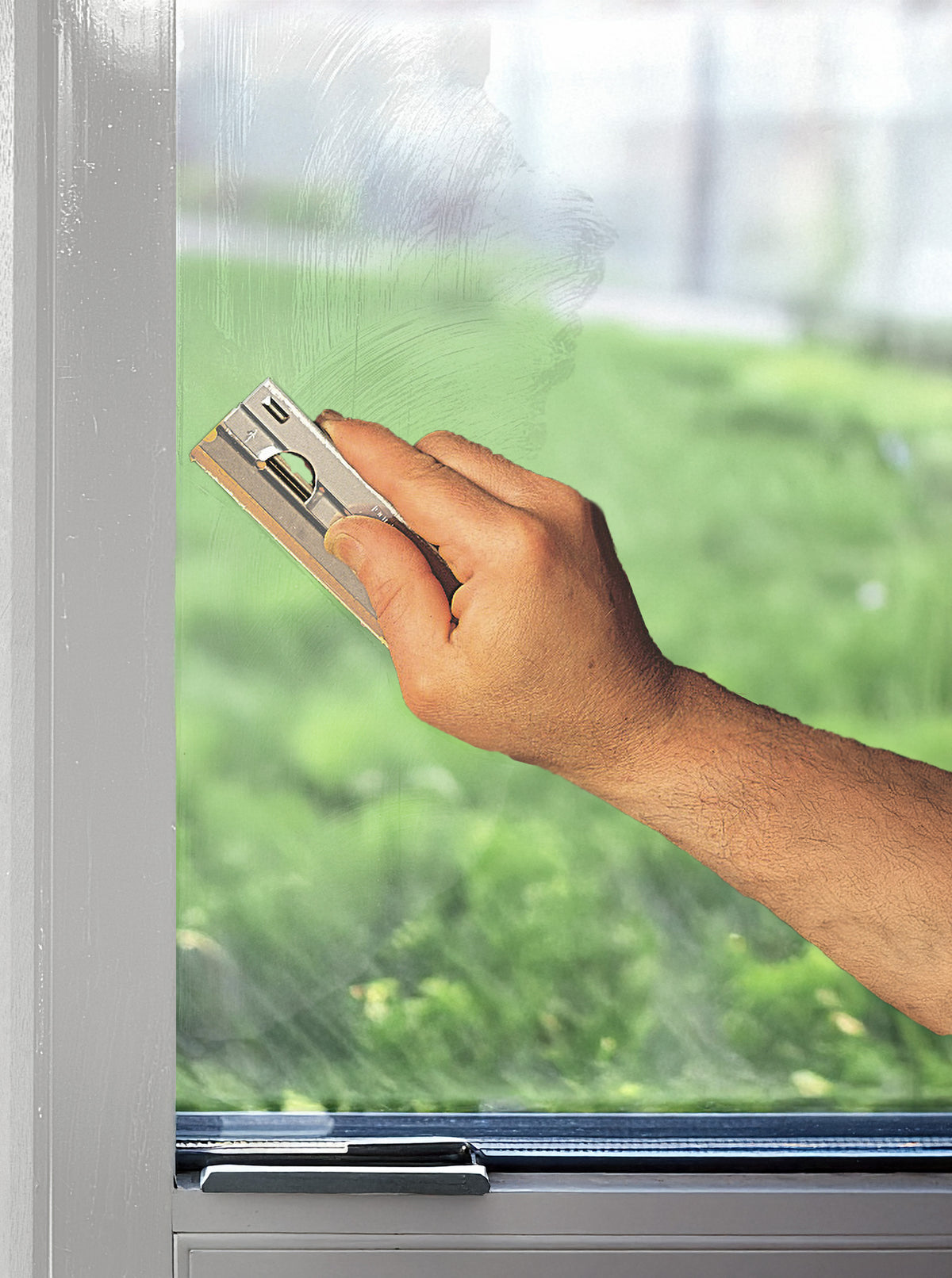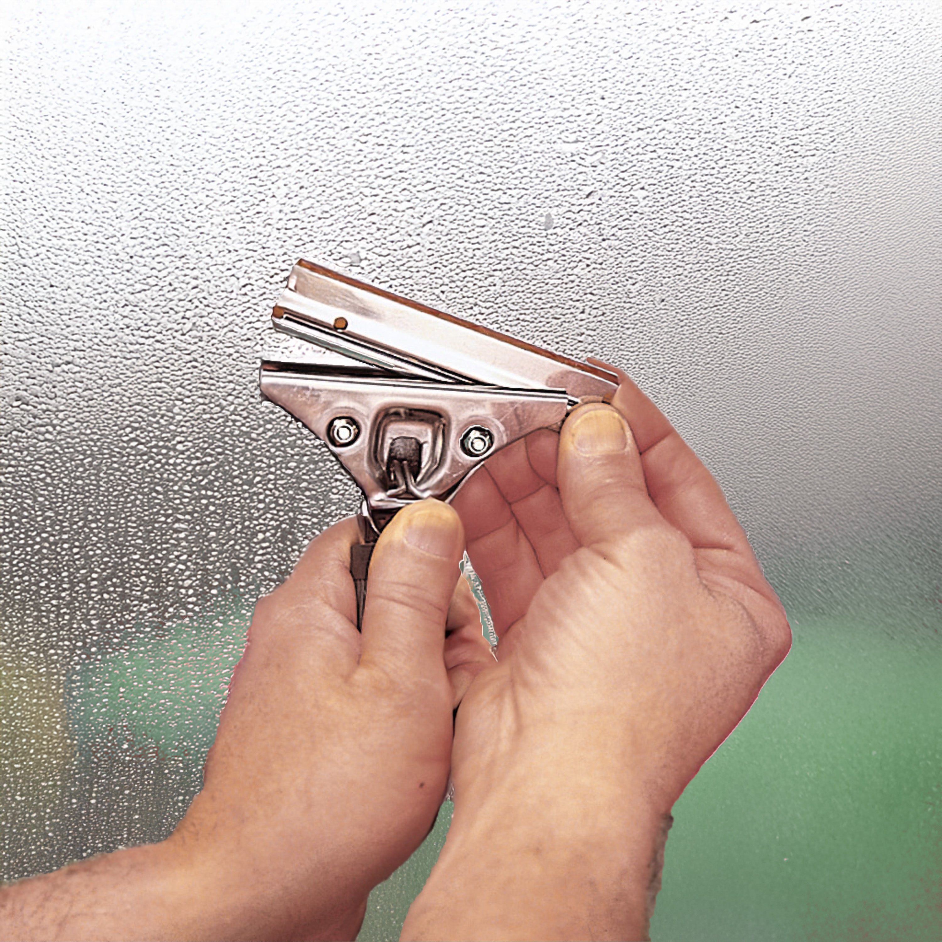 Grattoir à vitres dans support en inox. Dans étui en plastique